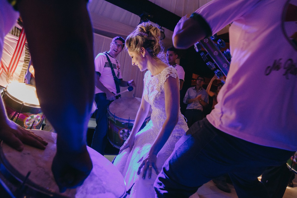 Partilhando da mesma ideia, quando começamos organizar nossa festa, entramos em contato com uma escola de samba da região onde nos casamos e fechamos o contrato para que também fosse um atrativo especial na nossa noite! Eles já tinham experiência de se apresentarem em casamentos. Chegamos a pensar em tocar algum instrumento junto com a bateria, mas infelizmente não conseguimos organizar nossas atividades para ensaiar, uma vez que morávamos um pouco distante. De qualquer modo, mesmo que só "na palma da mão", quando a batucada começou na parte final da festa o resultado não poderia ter sido diferente: coroou uma noite incrível levando muita alegria e entrosamento entre os convidados, que dividiam tamanha felicidade ao nosso lado!" - Thamiris.